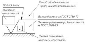 Шорсткість поверхонь на креслениках деталі вказують для усіх поверхонь, що виконуються за цим креслеником, незалежно від методів їх утворення, крім поверхонь, шорсткість котрих не обумовлена вимогами конструкції. Структура позначення шорсткості поверхні наведена на рисунку.