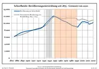 Динаміка населення з 1875 року в сучасних кордонах (Синя лінія: населення; Пунктир: відносна порівняльна динаміка населення землі Бранденбург; Сірий фон: період Третього рейху; Помаранчевий фон: період НДР)