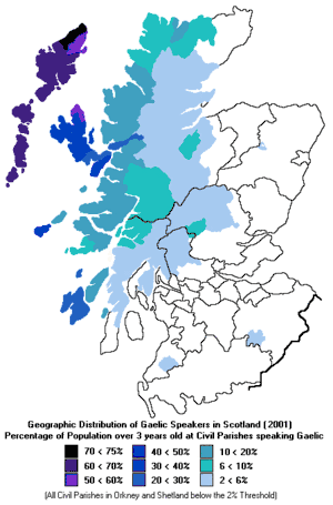 Понад 90 тисяч мешканців Шотландії володіють ґельською мовою, для 58 652 шотландців (1,2 % від усього населення Шотландії) — рідна (станом на 2001 рік)[5]. У 1991 році ґельська мова була рідною для понад 66 тис. мешканців Шотландії.