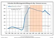 Динаміка населення з 1875 року в сучасних кордонах (Синя лінія: населення; Пунктир: відносна порівняльна динаміка населення землі Бранденбург; Сірий фон: період Третього рейху; Помаранчевий фон: період НДР)