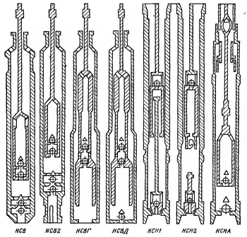 Відповідно до ГОСТ свердловинні штангові насоси повинні виготовлятися наступних типів (рис.): НСВ1 — вставний, одноступінчатий, одноплунжерний із втулковим циліндром і замком нагорі;