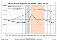 Динаміка населення з 1875 року в сучасних кордонах (Синя лінія: населення; Пунктир: відносна порівняльна динаміка населення землі Бранденбург; Сірий фон: період Третього рейху; Помаранчевий фон: період НДР)
