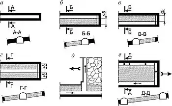 При розробці вугільних родовищ застосовуються три способи проведення штреків: вузьким вибоєм, широким вибоєм і спареними вибоями (див. рис.).