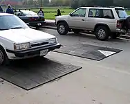 - Лежачий поліцейський (англ. speed hump або англ. road hump) — елемент дорожнього обладнання, технічний засіб організації дорожнього руху; пристрій примусового зниження (обмеження) швидкості руху транспортних засобів, штучна нерівність (піднесення) на проїзній частині. Встановлюється, наприклад, біля шкіл, пішохідних переходів тощо. У Бразилії може бути встановлений і на пішохідному переході, виконуючи одночасно і функції «зебри».