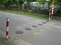 - Берлінська подушка (англ. speed cushion) — засіб зниження швидкості руху приватних авто. Складається з декількох штучних нерівностей, що розташовані поперед проїжджої частини з проміжками імж ними. Ширина цих елементів є такою, що приватні авто змушені пригальмовувати і виїжджати на підвищення однією стороною. В той же час, спецтехніка та автобуси, що мають більш широку колісну базу просто пропускають цю нервіність між колесами, що не впливає на їх рух. Також таку штучну нерівність без зупинки можуть об’їжджати двоколісні транспортні засоби.