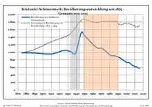 Динаміка населення з 1875 року в сучасних кордонах (Синя лінія: населення; Пунктир: відносна порівняльна динаміка населення землі Бранденбург; Сірий фон: період Третього рейху; Помаранчевий фон: період НДР)
