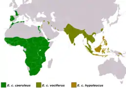 ![]() Ареал поширення E. caeruleus Гніздування Зимування | ||||||||||||||||