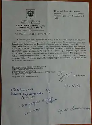 26 вересня 2017, пізно ввечері, на домашню адресу Лариси Шумкової, матері Олександра, надійшов лист від Слідчого комітету ФСБ РФ у Брянській області[1], де було сказано, що її син Олександр перебуває у Брянському СІЗО. У листі зазначалося, що Олександр Шумков затриманий працівниками ФСБ ще 8 вересня о 15 годині дня за підозрою в «скоєнні злочину» за ч.2 ст. 282 КК РФ — участь в екстремістських організаціях.