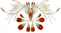 | Веслоногі раки (Copepoda) | Calanoida Cyclopoida Gelyelloida Harpacticoida Misophrioida Monstrilloida Mormonilloida Platycopioida Poecilostomatoida Siphonostomatoida | ![]() Calocalanus pavo (Calanoida: Calocalanidae) |