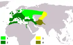 ![]() Carduelis carduelis carduelis 1 літо 2 весь рік Carduelis carduelis caniceps 3 літо 4 весь рік | ||||||||||||||