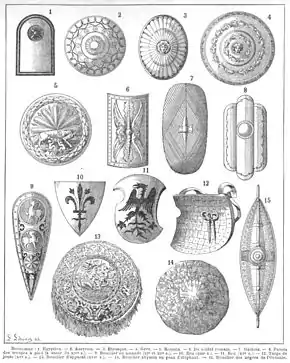 - Умбон — металева напівсферична або конусна накладка у центрі щита.