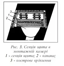 Щит (рис. 2) складається з 4–5 секцій. Розмір секції за простяганням становить 6 м, за потужністю пласта – дещо менше (4,5–8,0 м з інтервалом через 0,5 м). Секція є металевою рамою з куткових і швелерних балок, скріплених болтами, на яку в декілька рядів укладають колоди діаметром 25–30 см. З боку підошви пласта для кращого ковзання секцію обладнують санчатами з гнутих швелерних балок, а з боку покрівлі, щоб уникнути проникнення обвалених порід під щит, – сталевими листами (фартухами). Колоди з металевою рамою скріплюють за допомогою хомутів. Секції щита скріплюються між собою шарнірно за допомогою канатів. Згори на щит для запобігання попаданню дрібної породи під нього укладають металеву сітку. Перед монтажем секції посередині розсічки проводять за простяганням пласта канаву глибиною 1,5 м і шириною по верху на 1,5–2,0 м менше за потужність пласта, щоб біля покрівлі й підошви пласта залишалися цілики вугілля, на які спираються секції щита. Канава служить спочатку для витікаючого струменя повітря з діючої ділянки, а при роботі щита – привибійним простором. Щит монтується в горизонтальному положенні (рис. 3). Секції збирають ближче до покрівлі пласта для забезпечення можливості розвороту щита в робоче положення, близьке до нормалі до напластування з деяким випередженням біля підошви пласта. Деталі щита і матеріали кріплення подають вентиляційним штреком безпосередньо до місця монтажу. Перед пуском щита в роботу над ним створюють запобіжну породну подушку шляхом обвалення за допомогою підривних робіт стелини над щитом.Призначення подушки – збільшення маси системи «щит-порода» у первинний період руху щита й оберігання його від руйнування брилами породи, що падають на щит при обваленні. Крім того, обрушена на щит порода виконує роль тимчасового кріплення, зменшує зрушення й обвалення порід у безпосередній близькості від щита, а отже, і гірничий тиск на щит.
