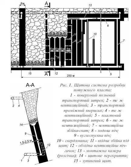Виїмку вугілля під щитом ведуть буропідривним способом. Відбите вугілля самопливом рухається вуглеспускними печами, звідки вивантажується у вагонетки або на конвеєр на транспортномуштреку. Очисний вибій при щитовій системі розробки провітрюється за рахунок загальношахтної депресії. Свіжий струмінь спрямовується з транспортного штреку в щитовий вибій через вентиляційну піч-гачок і найближчі до виробленого простору вуглеспускні печі. Вихідний струмінь повітря через крайню вуглеспускну піч і вхіднузбійку надходить на ходову піч і далі– на вентиляційний штрек. Унаслідок великих витікань повітря через вироблений простір і значних втрат вугілля виникає небезпека його самозаймання. Для запобігання цьому після відробки 3–4 стовпів здійснюють профілактичне замулювання виробленого простору, для чого з поверхні бурять свердловини і подають по них глинисту пульпу в обсязі 3–6% від об’єму виробленого простору. Переваги Щ.с.р.: відсутність у технологічному циклі трудомісткого процесу кріплення виробленого простору; простота управління гірничим тиском; малоопераційність очисних робіт, що зводяться в основному до виконання буропідривних робіт і розбирання вугілля у вибої; безпека робіт щодо наслідків падінняшматків вугілля іпороди; високі технікоекономічні показники; невеликі витрати лісоматеріалів. Недоліки системи: значні експлуатаційні втрати вугілля, що сягають 35–40%, більше третини яких є втратами за потужністю пласта; висока пожежна небезпека; нестійке провітрювання; великий обсяг проведення підготовчих виробок; значні зсуви земної поверхні. Умови застосування: круті, витримані щодо потужності й кутів падіння пласти, потужністю для секційних щитів 6-10 м, для безсекційних – 3-6 м, з міцністювугілля не нижче середньої, із тривкими породами підошви й будь-якою покрівлею. Подальше вдосконалення щитової системи розробки повинно йти шляхом застосування повної закладки виробленого простору, зменшення втрат вугілля в ціликах шляхом заміни їх штучними смугами з бічних порід, скріплених дешевими цементуючими матеріалами, і створення ефективних засобів механізації виймання вугілля під щитом.