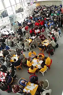 - Телефонна або онлайн-гра — за допомогою різних засобів зв'язку питання задаються командам-учасницям, які знаходяться в різних місцях, і так само приймаються їхні відповіді (приклади — телефонний чемпіонат МАК — «телефонка», Інтернет Гран-прі). Такий спосіб гри суперечить кодексу спортивного ЩДК, зокрема, через неможливість контролювати кількість учасників у команді.