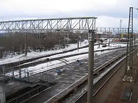 На станції дві острівних платформи, з'єднані пішохідним містком через колії.