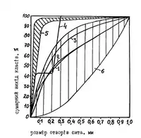 Сумарні характеристики крупності вугільних композицій: 1- за Г.Фулером, 2 — за М. Івановим, 3 — ТЕО МГТС «Бєлово-Новосибірськ», 4 — за В. Охотіним, 5 — фугати, фільтрати ВЗФ, 6 — матеріал з мулонакопичувачів Авдіївського КХЗ