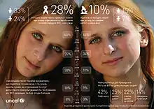 За даними офіційної статистики Міністерства охорони здоров'я України, у період з 1995 по 2012 рік у ВІЛ позитивних матерів народилося 32 504 дітей. З них 21 916 мають негативний статус; ще 6 735 малюків у віці до 18 місяців очікують на підтвердження свого статусу, а 2 814 — ВІЛ позитивні. У 752 дітей розвинувся СНІД, а 287 померло від захворювань, зумовлених СНІДом. Про конкретні заходи ЮНІСЕФ щодо захисту дітей та жінок від ВІЛ/СНІДу дивитись тут Серед них можна виділити: підтримку Уряду у розробці та реалізації першої Національної програми «Попередження передачі ВІЛ від матері до дитини в Україні на 2001—2003 роки», яка в результаті дозволила зменшити передачу ВІЛ від матері до дитини на дві третини, з 27 % у 2000 році до 6 % у 2008 році; посилення протидії ВІЛу на загальнодержавному рівні, розвиток потужної бази даних та підкріплених доказами підходів щодо роботи з підлітками груп ризику (ПГР); питання роботи з ПГР були включені до Загальнодержавної цільової програми забезпечення профілактики ВІЛ-інфекції, лікування, догляду та підтримки ВІЛ-інфікованих і хворих на СНІД на 2009—2013 роки[10]; включення профілактика ВІЛ до галузі «Здоров'я і фізична культура» Державного стандарту загальної середньої освіти[11].
