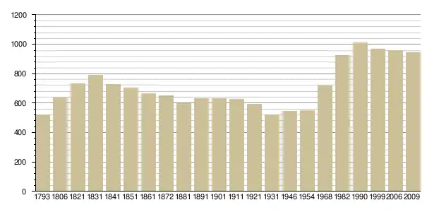 Динаміка населення (base Cassini de l'EHESS pour les nombres retenus jusque 1962[3], base Insee à partir de 1968 (population sans doubles comptes puis population municipale à partir de 2006)[4] · [5] ):