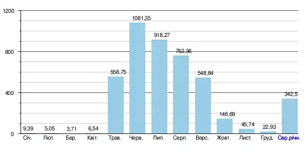 За період спостереження, абсолютний мінімальний місячний стік (абсолютний мінімум) становив 1,1 м³/с (у березні 1953 року), абсолютний максимальний місячний стік (абсолютний максимум) становив 3 100 м³/с (у червні 1970 року).