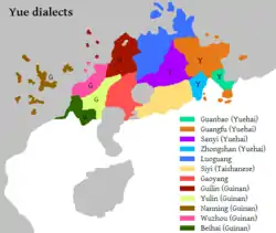 - юе-хай, що включає діалекти, на яких розмовляють в Ґуанчжоу, Гонконзі й Макао;
