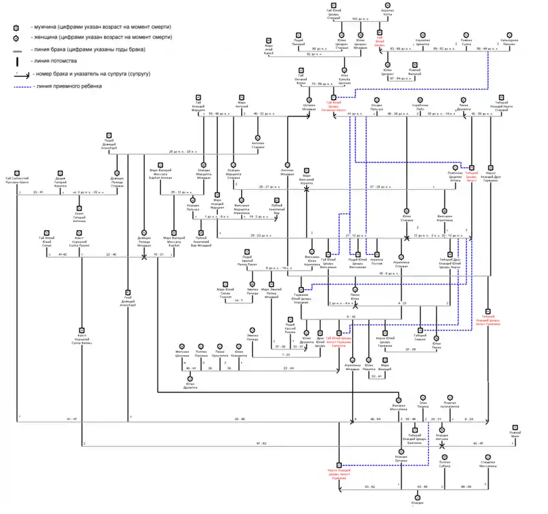 - Тиберій Цезар Август (42 до н. е. — 37) — прийомний син і зять Октавіана Августа, син Лівії Друзілли від першого шлюбу, прославлений воєначальник, другий римський імператор (з 14 р.)