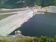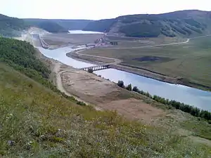 - насипна гребля з суглинковим ядром довжиною 605 м і висотою 70 м;