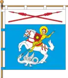 Квадратне полотнище поділене горизонтально на білу і синю смуги у співвідношенні 1:3. На верхній смузі два червоних римських списа, покладені навхрест. На нижній смузі Святий Юрій-Змієборець із жовтим німбом, у жовтих обладунках і червоним щитом, на якому жовте шістнадцятипроменеве сонце, верхи на білому коні із червоною збруєю, вражає жовтим списом білого змія.