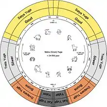 В індійській космології існує чотири ери: Сатья-юґа (Кріта-юґа), Двапара-юґа, Трета-юґа, і Калі-юґа. За індійською космологією життя у Всесвіті створюється і зникає з періодом від 4,1 до 8,2 млрд років, які складають одну добу Брахми. Впродовж неї цикли юґ повторюються, як пори року. Добробут під час них спирається на правдивість, милосердя, аскетизм і чистоту — «ноги бика дхарми». Разом вони панують тільки на початку циклу, в кожній наступній юзі одна зі складових занепадає, як наслідок занепадає і мораль, зростає страждання і коротшає термін життя людей.
