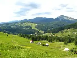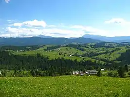 Вигляд на північну частину села. Вдалині — гора Хом'як (справа), хребет Синяк (посередині) та хребет Довбушанка (зліва)