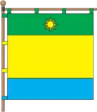 Квадратне полотнище розділене горизонтально на три смуги – зелену, жовту, синю – у співвідношенні 1:2:1. На верхній смузі жовте сяюче шістнадцятипроменеве сонце.