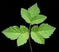 Листки двічі трійчасті або трійчастоперисті. Листя великі: верхні — трійчасті, нижні — двічі трійчасті. Квітки дрібні, білі, зібрані в складні парасольки. Цвіте в червні і липні дрібними білими квітками[1].