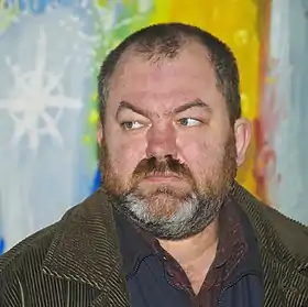 | Мирослав Ягода на фоні своєї роботи. Львів, 2006 | ||||
