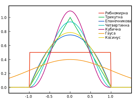 Звичайно використовують кілька видів ядрових функцій: рівномірну, трикутну, Епанечнікова, Четвертинну (двоточкову), кубічну (триточкову), Гауса та косинусну.