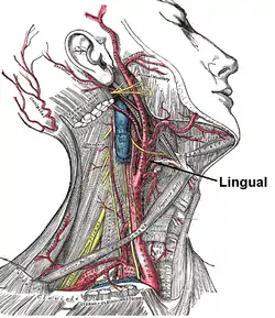 | Язикова артерія (позначена "Lingual") показана при поверхневій дисекції правої частини шиї | |