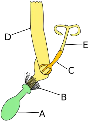![]() Язичкові квітки, від рослини у родині Айстрів: A. зав'язь B. чубок C. пиляк D. язичок E. тичинка | |