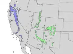 | Ареал: зеленим — A. concolor var. concolor, синім — A. concolor var. lowiana | |