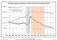 Динаміка населення з 1875 року в сучасних кордонах (Синя лінія: населення; Пунктир: відносна порівняльна динаміка населення землі Бранденбург; Сірий фон: період Третього рейху; Помаранчевий фон: період НДР)