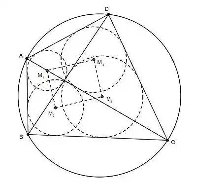 Розіб’ємо довільний вписаний в коло чотирикутник за його діагоналями, отримаємо трикутники, що перекривають один одного (кожна діагональ утворює два трикутники). Центри вписаних кіл цих трикутників утворюють прямокутник.