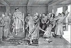 Галицькі бояри тягнуть на багаття попадю-чаклунку Настасію, улюбленицю князя Ярослава Осмомисла. Малюнок Клавдія Лебедєва