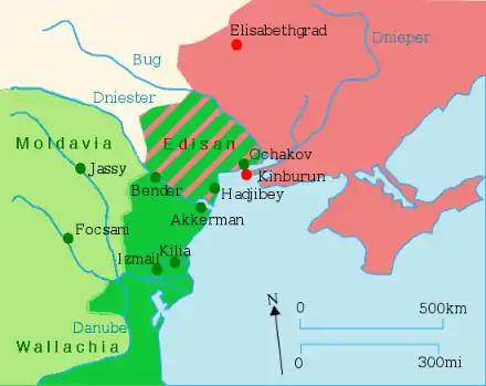 Договір підтвердив приєднання Кримського ханства й Кубані до російських володінь. Османська імперія відмовлялася від будь-яких претензій на Грузію і зобов'язувалася не вдаватися до ворожих дій проти неї. Росія повертала Османській імперії Молдовське князівство і Волощину, зайняті під час воєнних дій. Новий кордон між двома державами встановлювався на південному заході по р. Дністер, на Кавказі — по р. Кубань.