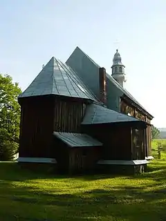 Поруч з костелом колись була дерев'яна церква святого Архангела Михаїла, збудована 1882 року, належала до парафії Устрики Долішні Устрицького деканату Перемишльської єпархії УГКЦ.[3] Після 1951 року її використовували як склад, а в 1975 році перенесли до Бандрова, перелаштувавши на філіальний костел[1].