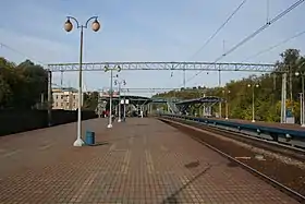 Складається з двох острівних платформ (4 колії), західна ширша, використовується частіше, а східна — майже завжди пустує. З'єднані пішохідним містком. У середній частині платформ встановлені напівпрозорі навіси. Платформи звужуються на південь. Турнікети на станції тимчасово відсутні через ремонт.