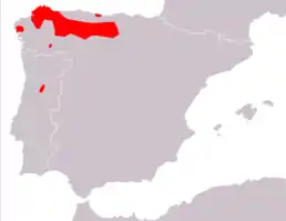 Ендемік Піренейського півострова. Поширений в Кантабрійських горах та в Галіції на північному заході Іспанії, в горах Сьєрра-де-Гредос в центральній Іспанії та Серра-да-Ештрела в центральній Португалії. Трапляється у субтропічних сухих лісах та в середземноморському чагарнику. Трапляється від рівня моря (в Галіції) до 2000 м над рівнем моря.