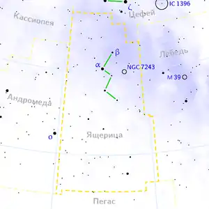 | Найяскравіша зоря | Альфа Ящірки 3,76m |