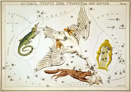 Сузір'я Лебідь, Ящірка, Лисиця з Гускою та Ліра із «Дзеркала Уранії», набору тематичних карток опублікованого у Лондоні, бл. 1825