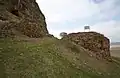 Старовинні фортечні стіни на території району. Збереглася лише частина стін і веж, розкиданих по всьому схилу гори.