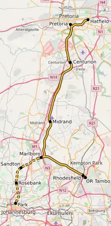 Ґаутрейн залізничний маршрут. Смугаста площа знаходиться під землею.
