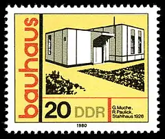 Сталевий будинок Дессау-Тьортен в стилі Баугауз (1926). Поштова марка НДР, 1980