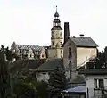 Комплекс було закладено на прямокутному плані навколо внутрішнього подвір'я з окремою господарською частиною з півдня[1]. Середнє крило, триповерхове, одновісне, покриває сідловий дах, опертий на аркадний фриз з люнетами. Фасади вкриті декоративними сграфітовими декораціями з геометричними мотивами та рослинними орнаментами[1]. Три трикутні фронтони височіють над карнизом. Другий поверх фасаду головного крила зі сторони подвір'я замикають лоджії з 1735 року. Центральна вісь акцентована високою вежею з вхідним порталом та двосторонніми сходами. З багатих, давніх інтер'єрів збереглися лише бальна зала з стукковими оздобами на стелі та кілька зал з мальованими балками, а також частково пошкоджені інтер'єри театральної зали та каплиці[1].