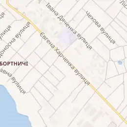 | Автобуси | А 104 (по вулиці Євгенія Харченка) |